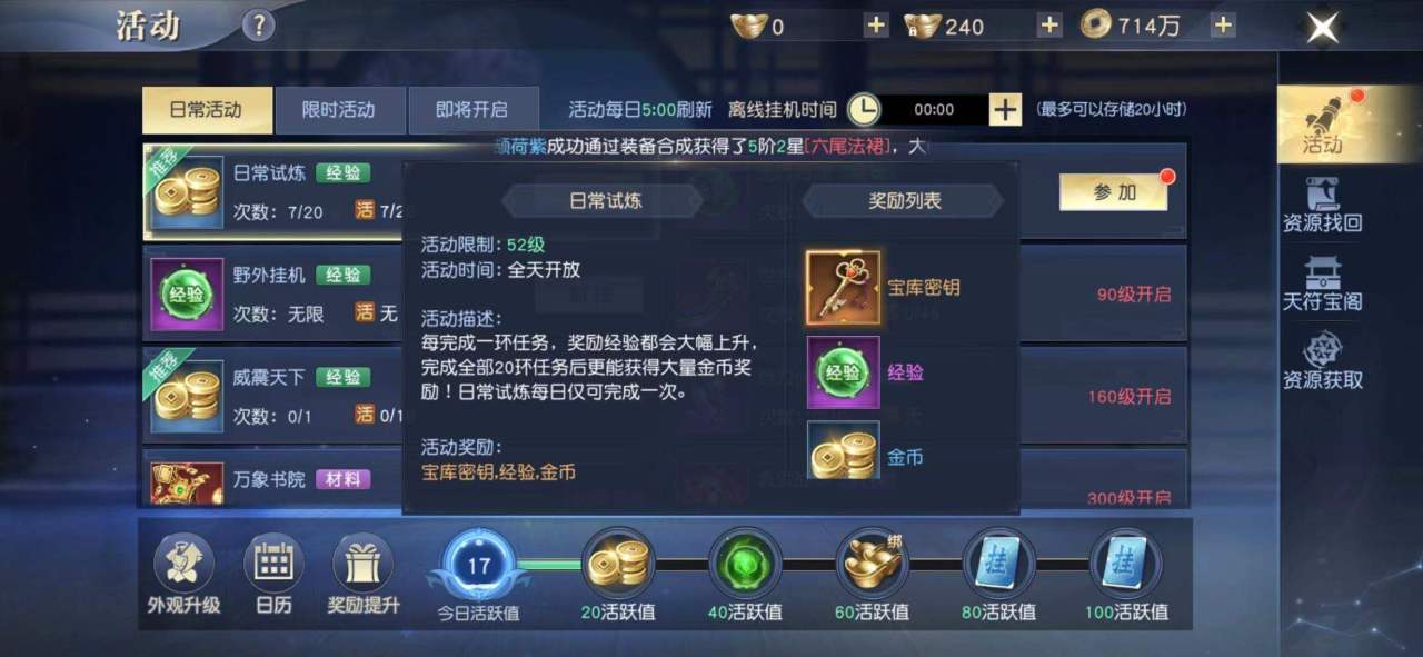 活动限制72级,参加需要门票,但是进入后可以获得大量经验来提升战斗力。进入副本后在规定时间内打败更多的怪物,就可以获得非常多的经验,组队进入更可以提高效率,配合1.5被经验卡使用可以快速提升等级。
