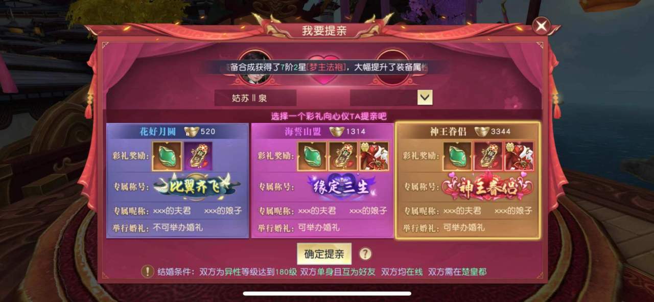 首先办理结婚是一个很漫长的过程,先要找到心仪之人要向她/他提亲,提亲就需要一笔不小的费用,提亲的对象要求必须是异性,等级达到180并且双方都要是互相的好友,都到楚皇都才可以结婚,提亲的彩礼分为三个档次,花好月圆,山盟海誓,神王眷侣,花好月圆提亲需要520个绑定元宝。山盟海誓需要元宝1314,神王眷侣最多需要3344个元宝,当然我们为了心仪的人付出这点不算什么,提亲后就等待对方答应就可以了,若是不答应元宝会退回给玩家。