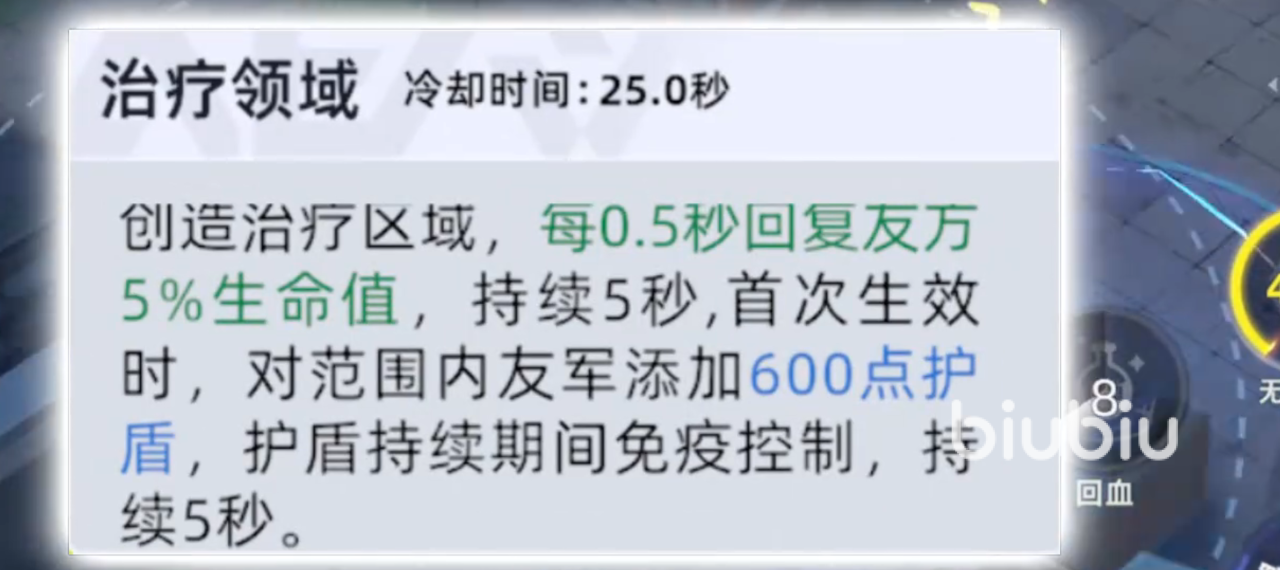 先来讲他的技能机制,被动急速循环,每次命中敌人,都能减少这名角色的所有技能冷却时间,这个被动是核心,只要玩家枪法够准,一技能和二技能就能高频刷新,一技能翻滚,可以向前位移一小段距离,配合被动,打中几枪就能刷新,这是这名角色唯一的位移技能,逃跑、拉扯全靠这个技能,二技能治疗领域,在目标位置释放一个圈,每秒回复4%的最大生命值,持续5秒。
