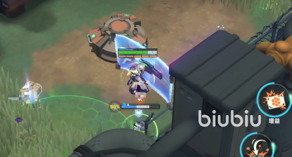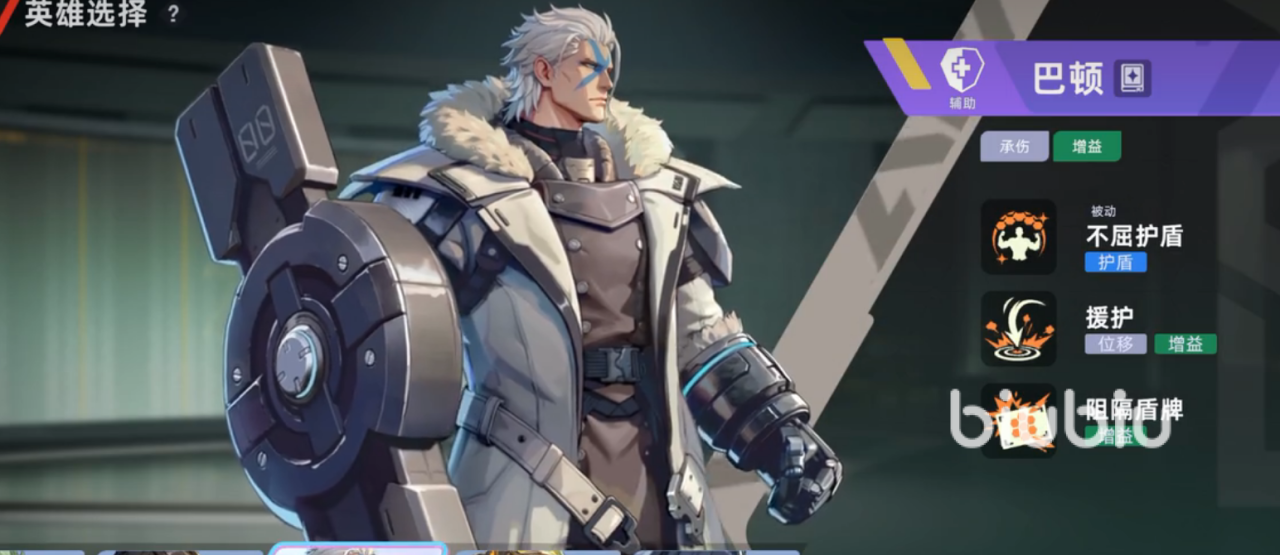 巴顿手持巨盾,他的技能组便是围绕着手中盾牌展开的。被动技能不屈护盾,在被破甲的时候获得1500点护盾。一件紫色品质的完整紫甲也就加900护盾,足以说明巴顿被动技能的强力。一技能援护,巴顿位移一段距离且对附近敌人产生击退效果,对自身和附近队友提供3秒30%的减伤buff;大招阻隔盾牌更是能完全格挡飞行子弹的神技。进可控制敌人,退可掩护队友。