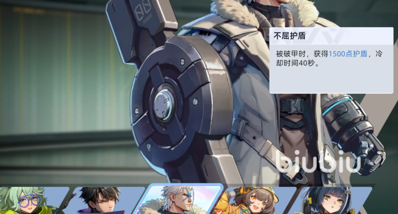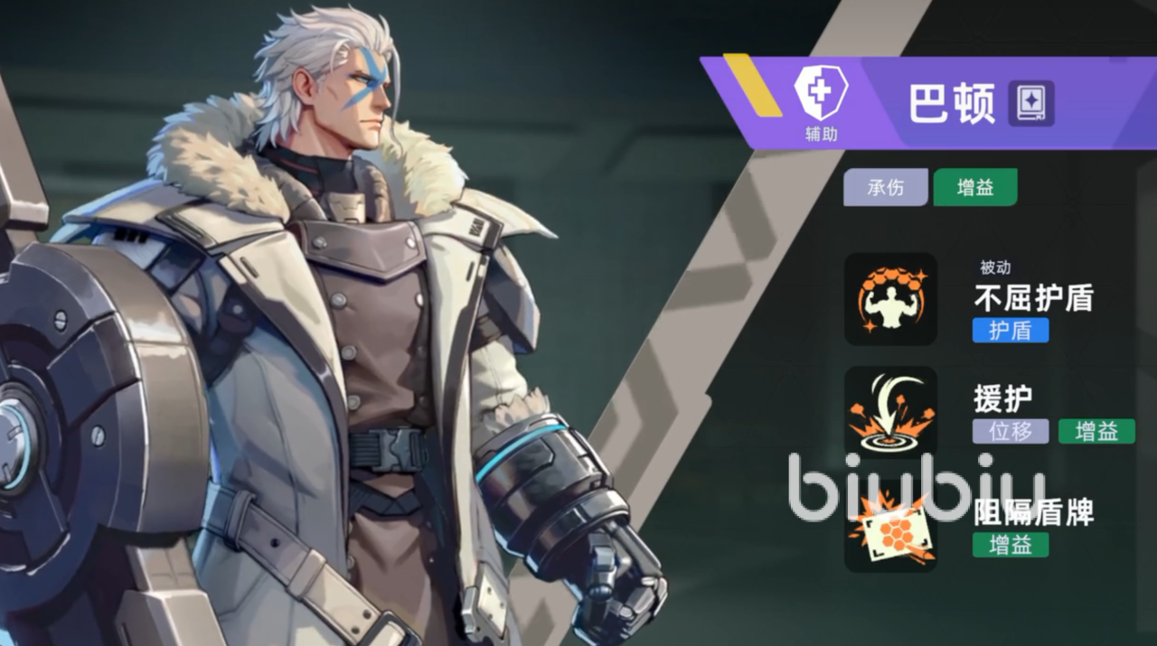 巴顿的被动技能,不屈护盾,在被破甲时自动获得1500点护盾,内置冷却40秒,这是该角色的核心生存资本,触发条件比较简单,只要护甲被打烂,就会自动获得护盾,而且护盾在本作中优先级很高,不占血量,关键时刻这1500点护盾很可能就是反杀的机会,一技能援护,跳向目标地点,击退附近敌人,同时给自己和周围队友提供30%的减伤,持续3秒,这个技能非常强力,不光带有位移,而且也是游戏中为数不多的团队减伤技能。