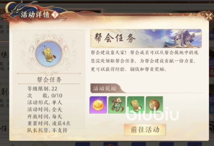 第二个方式就是加入帮会,大家加入帮会之后会有一些基础的任务做,这些任务一般都是比较好完成的,其中有一些贡献任务,大家只要将需要的物品交上去,就可以在上面获取简单的奖励,奖励中就有一些铜钱。