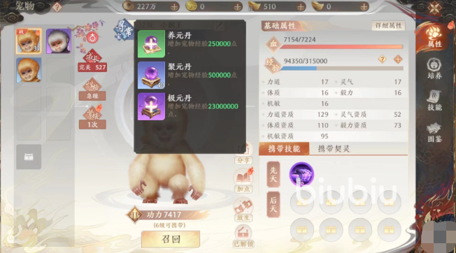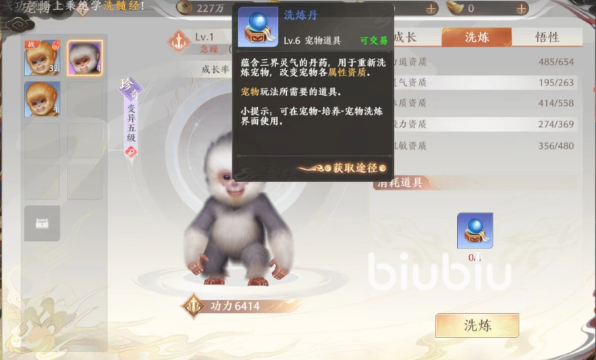 最后就是培养中的洗练以及悟性,大家在宠物变异之后就可以洗练它们,洗练丹是需要的道具,大家可以购买使用,而悟性也是有等级之分的,等级越高的时候其实这些宠物的属性也会有加成,后期会影响到宠物的各属性升级情况。