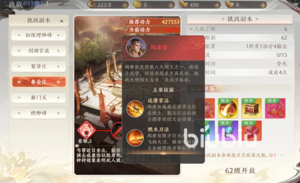 其中的boss有好几个,第一个出来的是鸩摩智,这个boss有火系的攻击,受到它大招的攻击玩家会持续的掉血,所以建议大家在上面不要一起行动,打败鸩摩智的难度不大,就是需要注意一下不要让一个人抗伤害,他对玩家造成的伤害次数多了之后玩家的经文会掉。