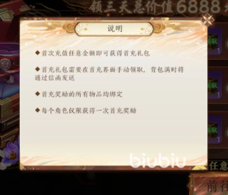 在这款游戏中首充是最便宜的充值机制,只需要花六块钱就可以充值成功,奖励在上面还是跟六块钱属于正比的,充值完了首充之后大家就可以在上面连续三天有奖励,在奖励的等级上面每一天其实都是差不多的,但是奖励的都是不好获取的道具。