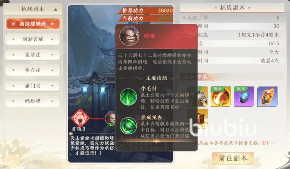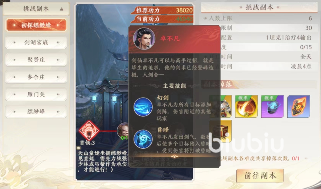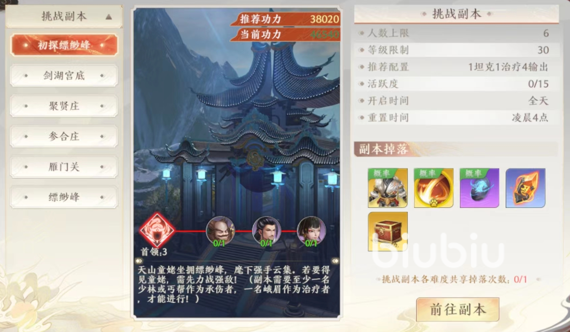 初探缥缈峰应该数属于玩家第一个参与的副本,这个副本的挑战等级不算很高,大家只要是到了三十级左右就可以去挑战了,在搭配阵容的时候建议大家是多注意一下输出,因为输出在这个副本比较重要,数量也需要的多一点。