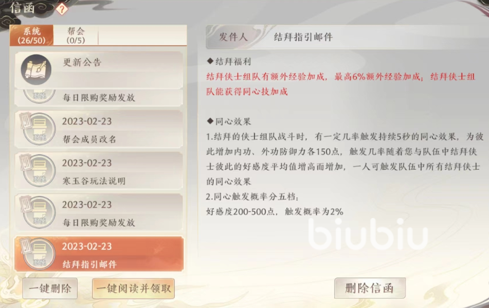 在大家结拜之后其实也是要经常在线一起游戏的,因为大家结拜之后的结拜值是从零开始累积,大家组队参与任务,或者是通关副本,以及大家一起组队的在线时间积累起来其实都会有结拜值奖励,结拜值越高以后大家触发同心效果的几率就越高哦。