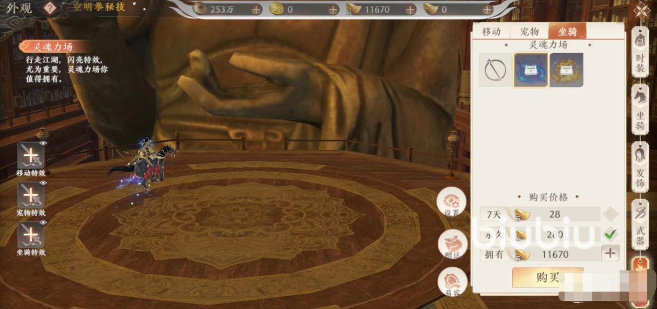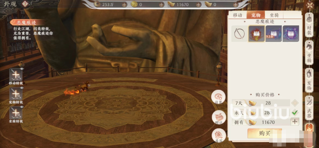 其次就是宠物的特效,宠物的特效其实也不是宠物身上的特效,反而跟移动的特效是差不多的,大家可以在上面选择一下,不过这些特效相比移动的特效更加霸气,一般这两种特效其实都是可以通过元宝来获取的,如果大家想在上面获取的话,就只能充值或者是等到做活动。