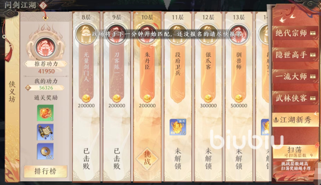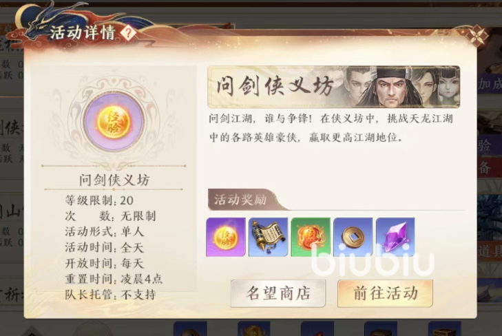 就比如在问剑侠义坊中大家是跟系统boss作战,进入相应页面中大家可以看到上面的挑战层数,从第一关开始闯关,每一关的难度逐步上升,奖励也是逐步提升,而且这个活动是只要大家到了20级之后就可以参与的了,就是不能组队参与。