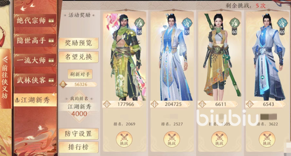 问剑江湖里面大家可以参与两个活动,一个是问剑侠义坊,另外一个是江湖宗师,一个是跟系统的boss对战,另外一个是需要跟玩家对战,大家要根据自己喜好的玩法来进行挑战,不过每一个模块中大家闯关成功获取的奖励是不同的。