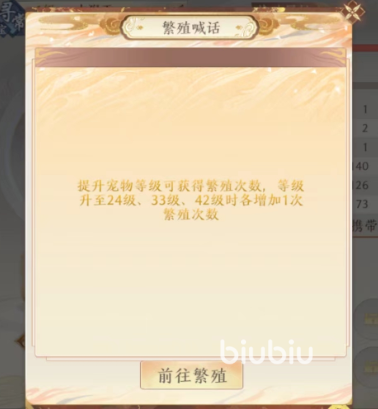 其实不管获取什么宠物,在游戏中都是可以进行繁育的,在宠物的详情中大家可以看到目前宠物的属性,繁殖次数不是已经繁育过多少次,而是这只宠物可以繁育的次数,大家要是想要有更多的繁育次数,其实是可以在上面升级的,因为随着宠物等级提升在24、33、42级的时候会有次数提升。