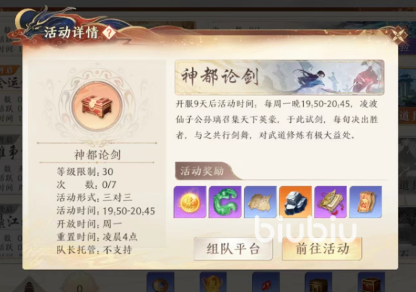 神都论剑的活动是每周一可以参与的一个定时活动,只有在周一大家才可以参与,还要到晚上的7点50才会开放,到了8点45分的时候游戏就会结束,所以大家要记好参与时间,进入其中的时候大家是需要组队进行三对三的对战。