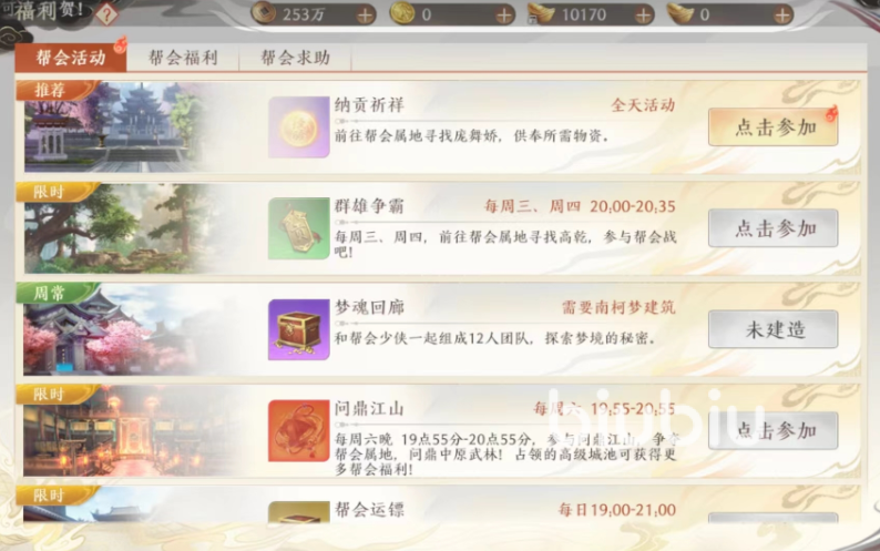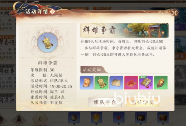 大家只有在进入了帮会之后才可以在上面开启群雄争霸,这个活动也是有服务器的基础等级要求的,满了九天之后大家才可以在上面开启,开启之后每周三以及周四都是可以参与的,不过只有晚上的时间才开始,从七点开始,一直持续一个小时五十分钟。