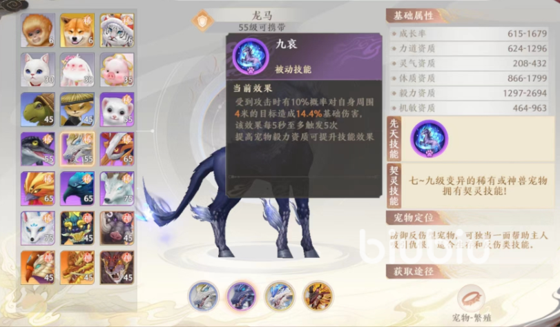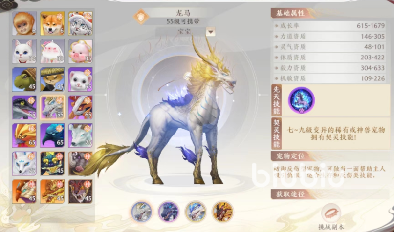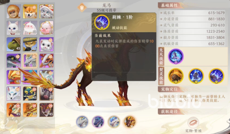 龙马其实是一个稀有的宠物,在游戏中也是外形看起来既像马又像龙,要是大家后期培养的话,其实到了九级左右能够做到跟麒麟差不多,它的先天技能是一个反击技能,使用这个技能的时候可以造成四米范围之内的反击,范围还是比较大的。
