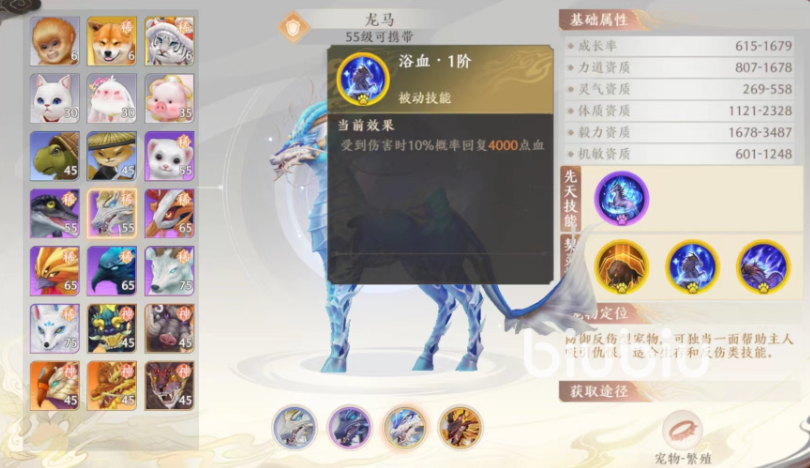 在变异之后龙马会有三个新技能,一个是鸿蒙,这个技能其实很多宠物都子阿变异之后解锁了,在触发的时候可以造成属性伤害,而且作为生存技能也是不错的,第二个技能是一个恢复技能,叫做浴血,会在受伤的时候触发,在触发之后有机会可以恢复自己的血量,这个技能可以说是亮点了。