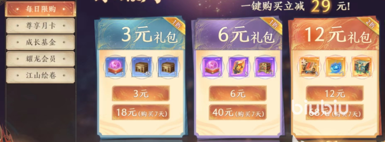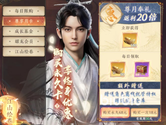 首先推荐大家去每日特惠里面看看,开一个月卡,目前是有两个等级的月卡,一个68一个128,要是不想开长时间的,也可以30来一个月尝试一下,获取的特权除了道具之外还有离线托管的设置,对于新手来说最好用的海慧寺随身仓库,定向交易以及离线摆摊其实也不错。