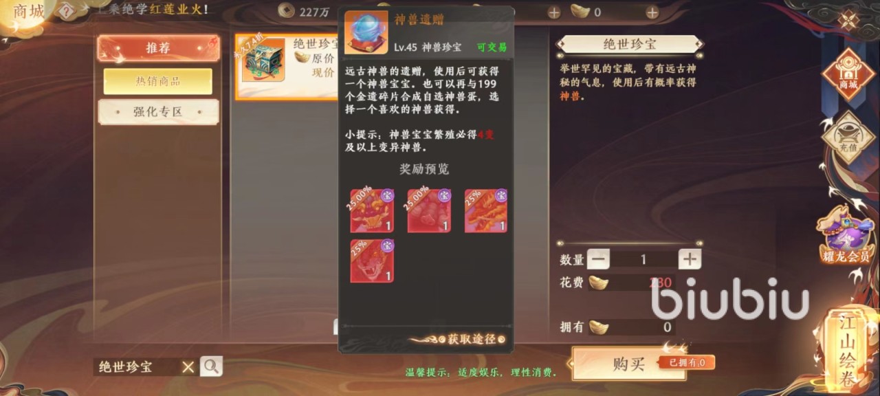 目前神兽并不能通过战斗掉落等方式打出来,唯一能够获取的就是在元宝商城中找到热销商品之后,里面可以发现有神兽遗赠,这是远古神兽给玩家带来的礼物,只要购买使用之后就能获得一个宝宝。但是具体出现哪种,完全随机生成。共有4种可以选择,每种几率都是25%,所以得到的不一定是自己最需要的那个。
