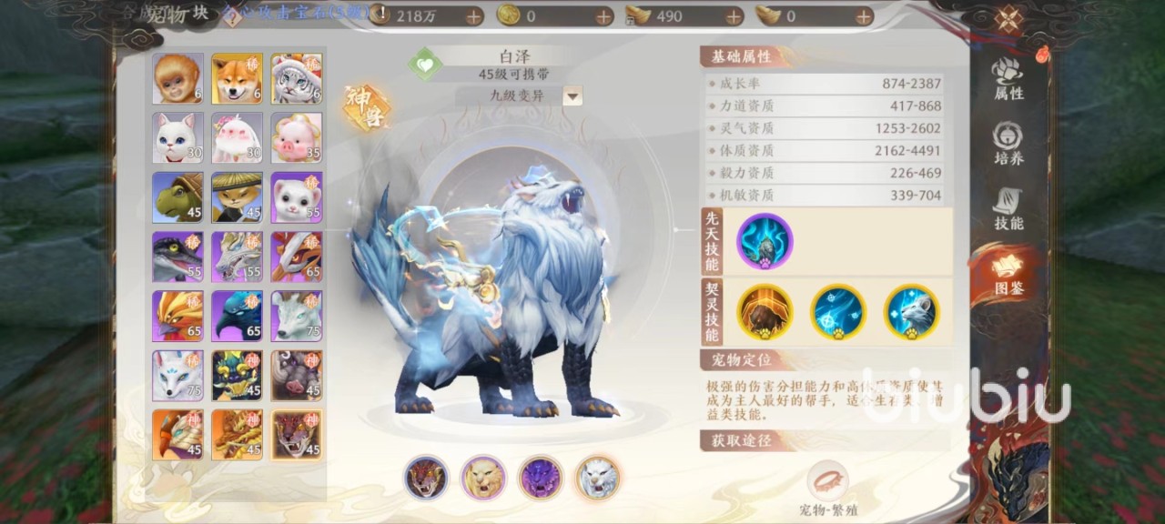 神兽宝宝并没有很强战力,所以后续还要继续养成,必须经过后续繁殖之后才能获得真正具有战力的宠物。神兽繁殖和其他宠物相似,都是需要组队前往,但区别是神兽宝宝繁殖所得到的都是四级或更高等级的变异类型,这样在培养难度上就会降低些,也提升了这一类型宠物的下限。除了直接使用,得宝宝之外,还有另外途径就是搜集199枚金匮碎片后,合成得到自选神兽蛋。自选蛋在使用时候就有很强指向性,不再是按照几率随机出现,而是根据自己喜好和需要,指定一个进行选择,这样虽然增加了些难度,但是在选择时候不会再出现自己不适合使用的情况。
