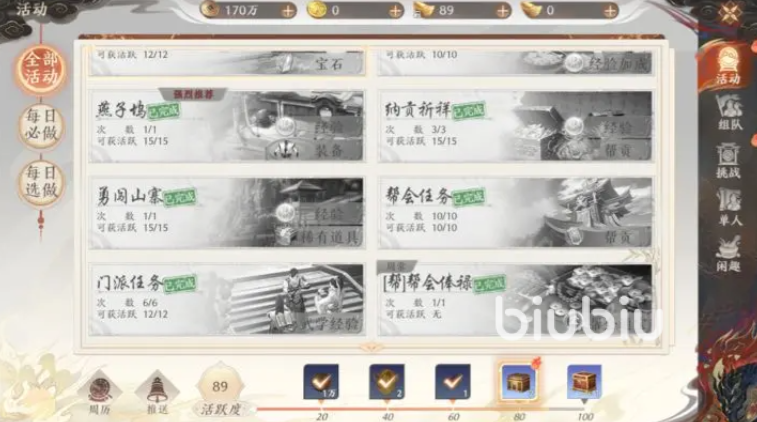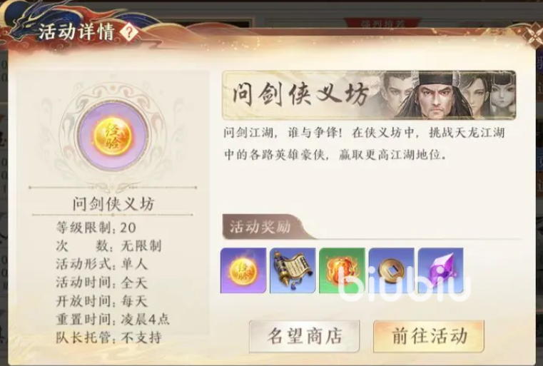 副本任务,在前期阶段,如果是单人情况下,建议各位玩家们去打打问剑侠义坊这个副本任务,玩家们可以在首次挑战胜利后获得海量的经验的同时,并获得一些道具奖励。而且这个任务某种意义上也可以看作一种日常任务,随着我们后续挑战陈述的递增,之后扫荡获得的奖励也会更加丰厚。
