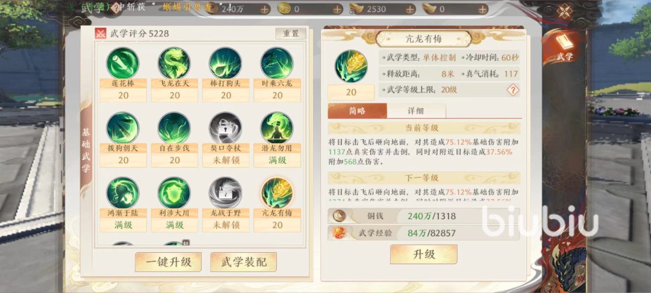 在控制方面除了减速之外还有潜龙勿用这样的神技,使用之后令周围范围内敌人全部进入到失明状态,处于失明影响下的目标无法进行各种操作,并且会漫无目的的随机移动。在防御状态在下还能做于嘲讽技能使用,将大量小怪全部拉到自己这边保护其他队友。最后在保证自身生存方面,除了上面所说的超厚血量之外,还有强化技能龙战于野,看准时机释放,能够增加自身超高闪避和减伤效果,既能用于抵抗boss释放的技能,也能在PK的时候扛住对方爆发。