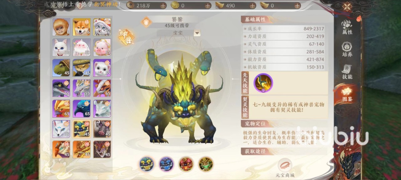 如果是逍遥,武当,天山这样本身输出就很强势的门派,那么日常可以携带些防御高或是血量高的宠物当做肉盾。这样宠物在前方扛住伤害,自身就能在后方持续不断输出,再加上宠物也能携带各种增益技能,辅助本体打出更高伤害。神兽中的饕餮、白泽等就是最佳选择,此外在稀有宠物中夫诸、龙马等也很合适。尤其是龙马,自身不仅毅力资质超高,防御力强,还能利用先天技能触发反伤,这样既能抗伤害也能补充部分输出。