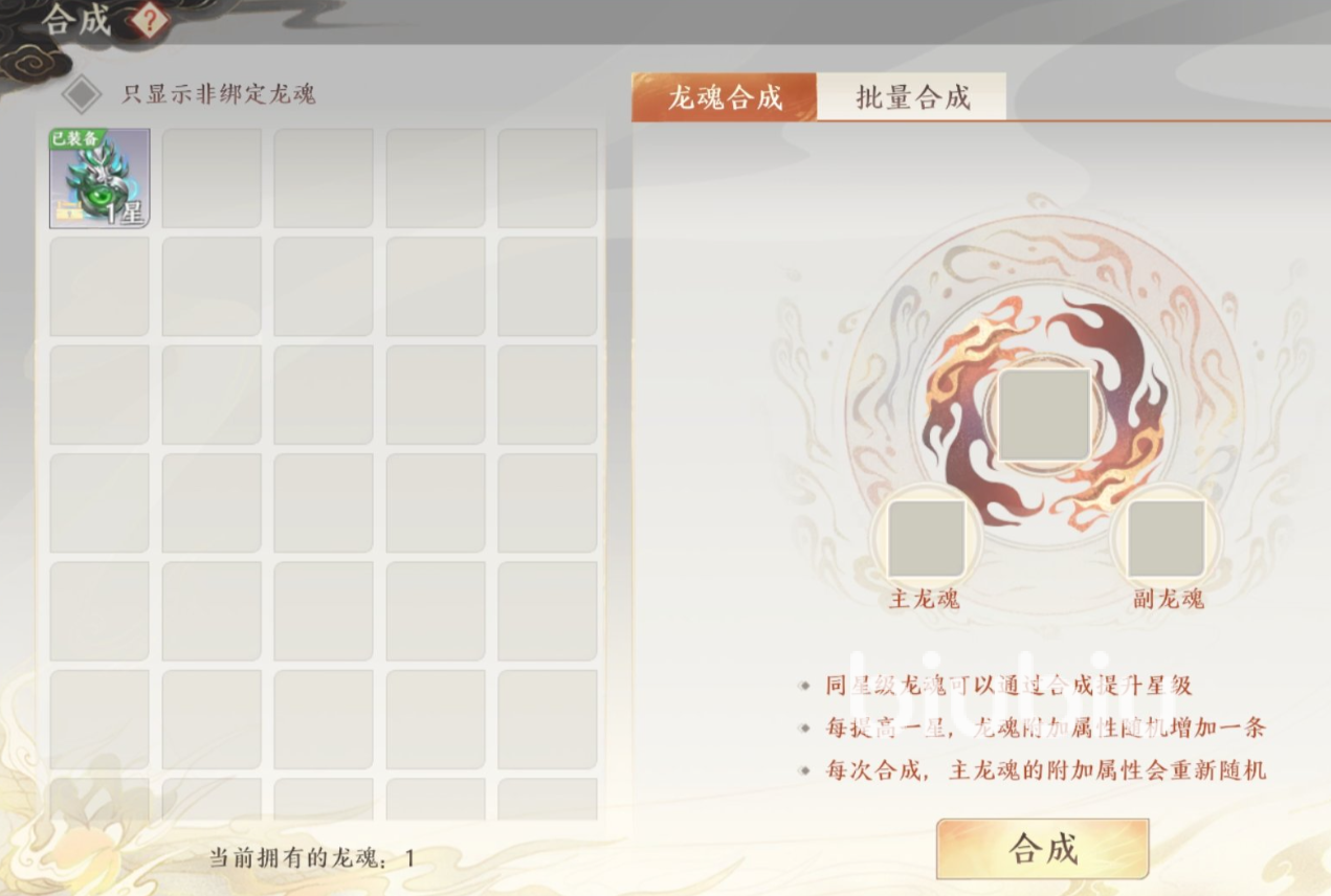 这里要进行合成是要达到指定的条件才行的,首个要求便是进行合成的两个龙魂为同星级的,它们合成以后各位可以获取到提升了一个星级的龙魂,此处最多能够将其星级提升到九颗星,这也就是它的极限了。