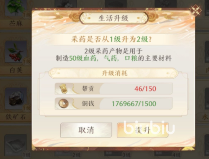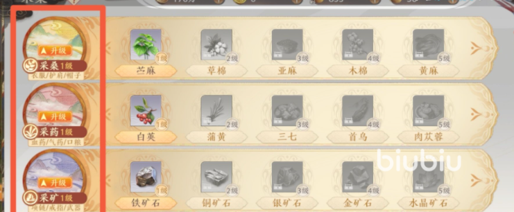 生活系统的第1部分被称为采集。采集在游戏当中也可以被分为四个不同的采集点,第一个点叫采桑,玩家在游戏当中采集荨麻、草棉、亚麻、木棉等这类植物统一在游戏当中都是采桑。采集白英、蒲黄、三七、首乌等一系列药材统称为采药。采集系统当中还有两个不同的点叫采矿和打猎。采矿就是采集矿石,打猎玩家学习之后就可以打猎获取想要的兽皮。学习生活采集技能和升级都是要消耗一定的帮派贡献和铜钱的,玩家只有不断的升级采集系统才能获得等级更高更好的材料。