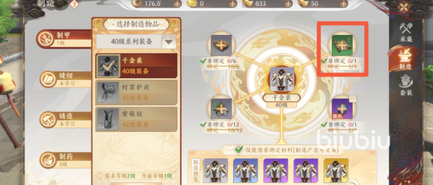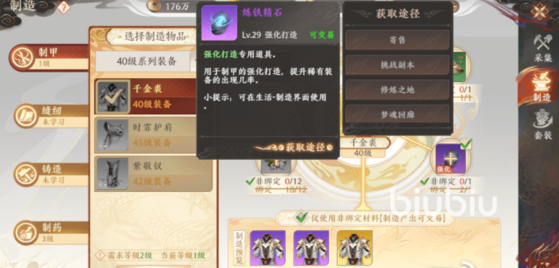 玩家在获取一定的材料之后,就可以带着自己的材料前往制造系统进行制造了。制造系统也被分为不同的单元,其中制甲系统可以帮助玩家成功造出装备里的上装、护甲以及头冠。缝纫系统则能够帮助玩家制造出腰带,手套和靴子。铸造系统则是通过玩家拥有的材料制造出项链,戒指以及武器。制药系统能够帮助玩家制造出角色的恢复气的药品,宠物补充血量药品以及角色补充血量的药品。