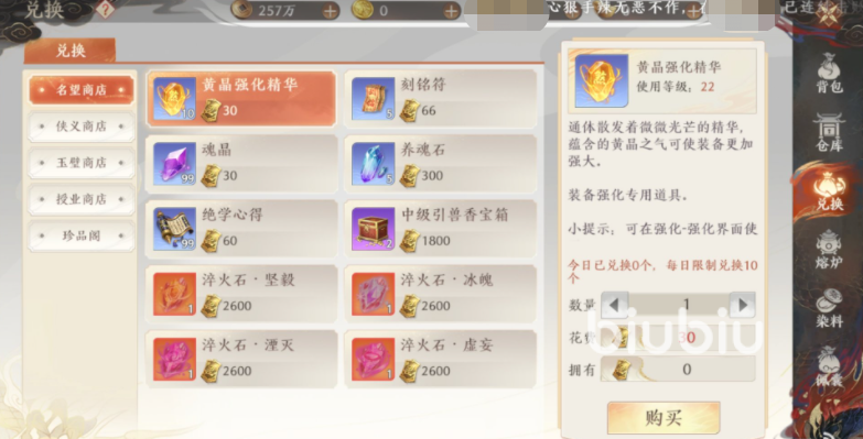 其五,玩家可以找到游戏当中的名望商店,商店也有精华供玩家自由兑换,但是这个也有限购的,每个玩家最多一天兑换十个哦!除了这些以外,还有一种只需要玩家能够持续登陆在线一个半小时就能够得到在线礼包,在线礼包当中同样也会出现黄晶强化精华的身影。