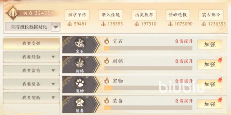 为了让大家能够更直观的了解到自己当前的状态,所以在游戏里就会有变强系统,在那里会将你们当前的场景进行不同的类别区分,然后你们可以通过这些数值来确定自己应该提升哪个方面的等级。