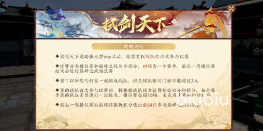 试剑天下这个玩法有两种模式,分别为淘汰赛和巅峰之战,一个赛季持续4周的时间,最后一周结束之后就能够进行最终的淘汰赛了,小伙伴们能够和朋友一起组成战队,不过相同门派的小伙伴不能够超过两人哦!如果小伙伴们是以第一次参加比赛的时候,会根据战力获得一定的积分,每个赛季开始的时候都能够重新报名,每周如果没有完成10场比赛的话,会扣除一定的积分哦!