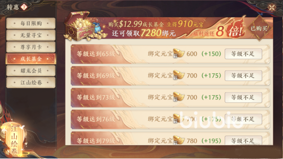 另外此处有个叫做成长基金的东西,各位最好不要错过此物品,它可以说是性价比非常高的商品了,购买之后能够直接获取到不少元宝,之后角色每次提升到对应的等级后,都能够在此处获取到指定数量的绑定元宝。