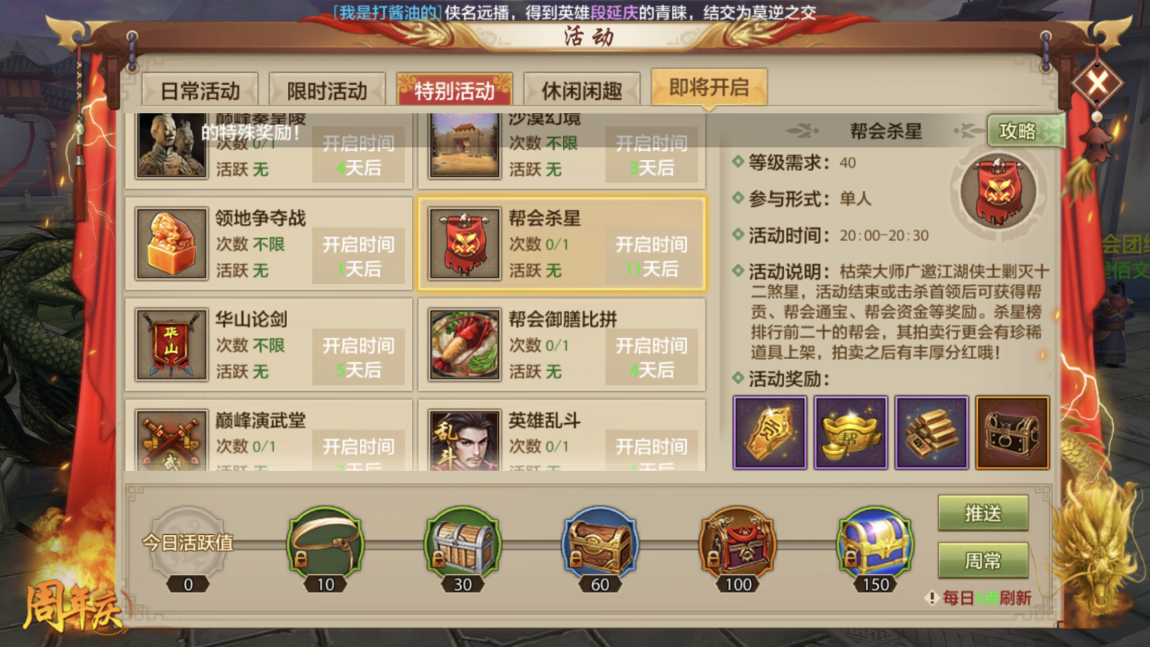 帮会杀星并不容易碰上只有20点到20点30分这半小时之间才能参加,且间隔日期很长我们可以在活动-即将开始活动页面中查看距离开启帮会杀星活动的天数。