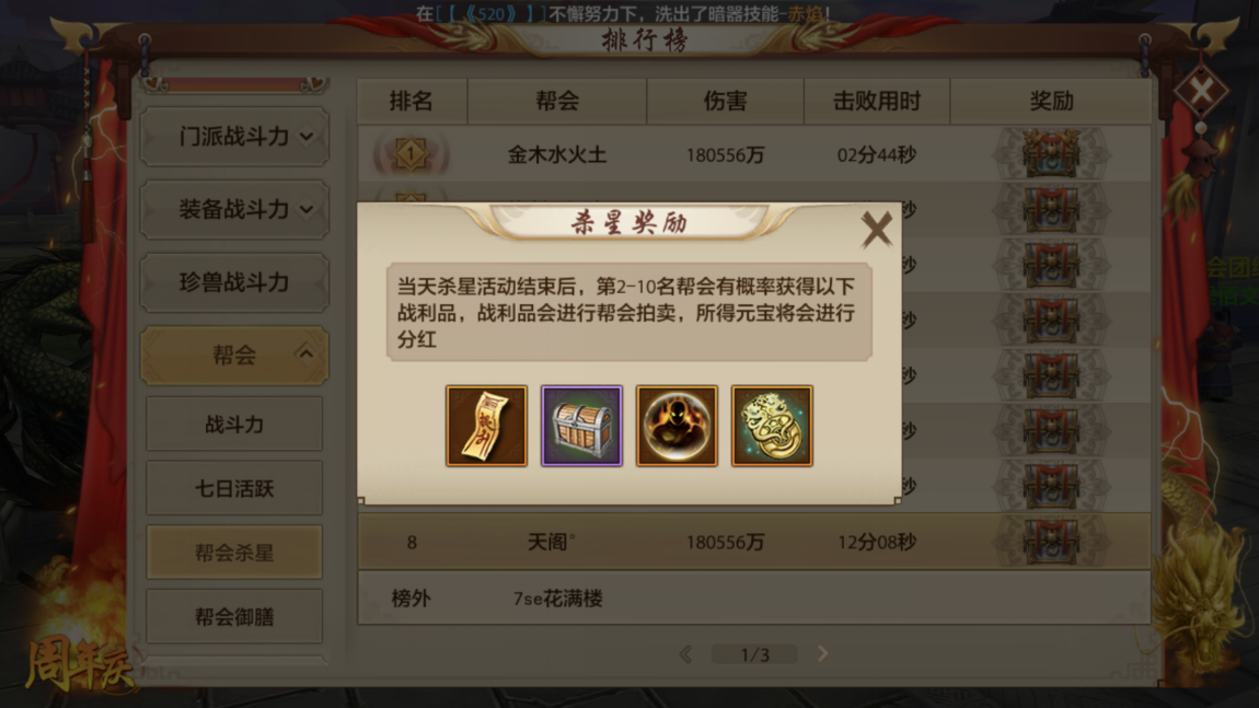 除了伤害力排名会获得不同的奖励全服帮会击杀星的速度也是分配奖励的依据。