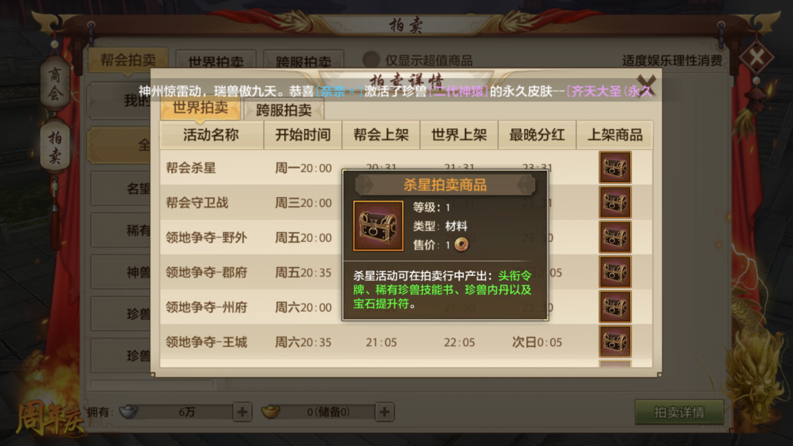 每周一20点开启杀星活动,帮会拍卖物品将于20:31在帮会拍卖上架。帮会成员可以用优先进行拍卖,21:31物品将会在世界拍卖上架届时所有人都可以对物品进行竞拍。最晚分红会在23:31发放到参与活动的帮会成员邮箱中,但如果物品在世界拍卖上流拍系统会将其进行折价回收。