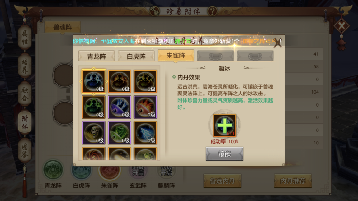 点击阵法可以将已拥有的内丹镶嵌在其中,点击已镶嵌的内丹,既可以使用相同的内丹提升等级或进行更换。如阵眼内无珍兽附体或珍兽与法阵分离则内丹无法发挥作用。