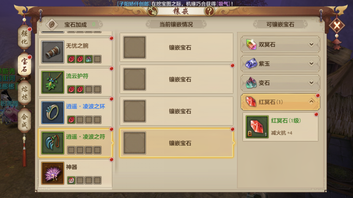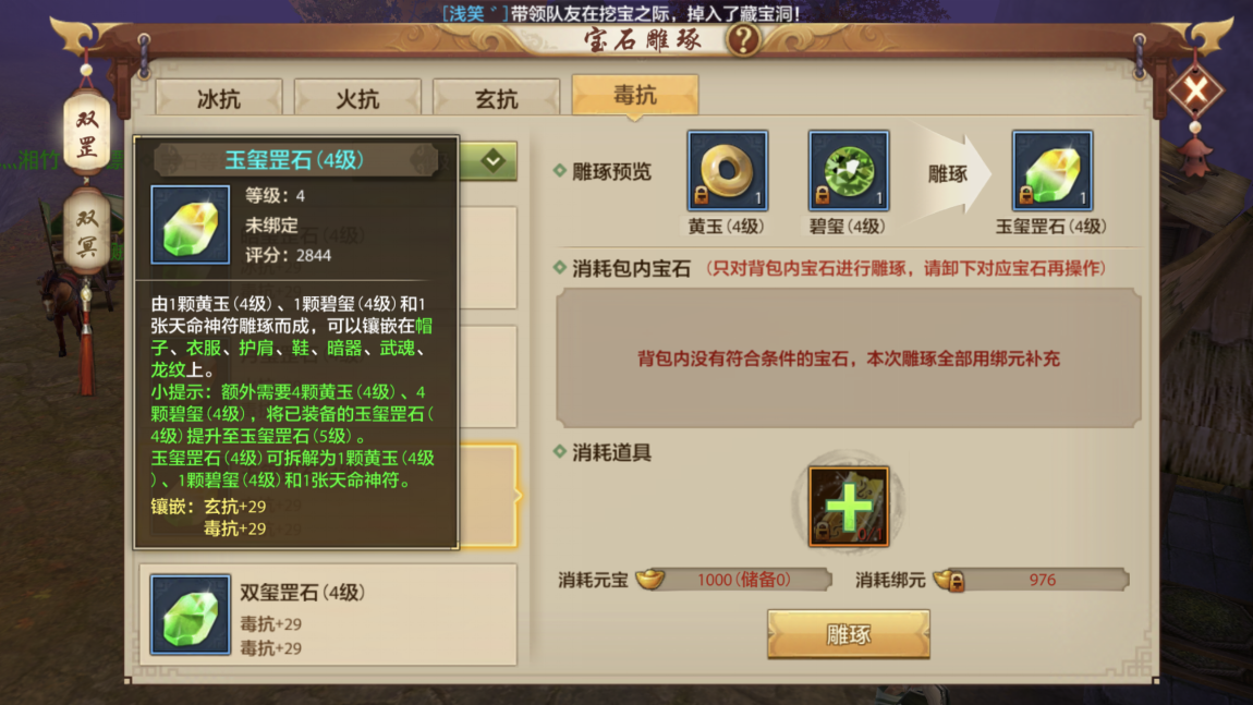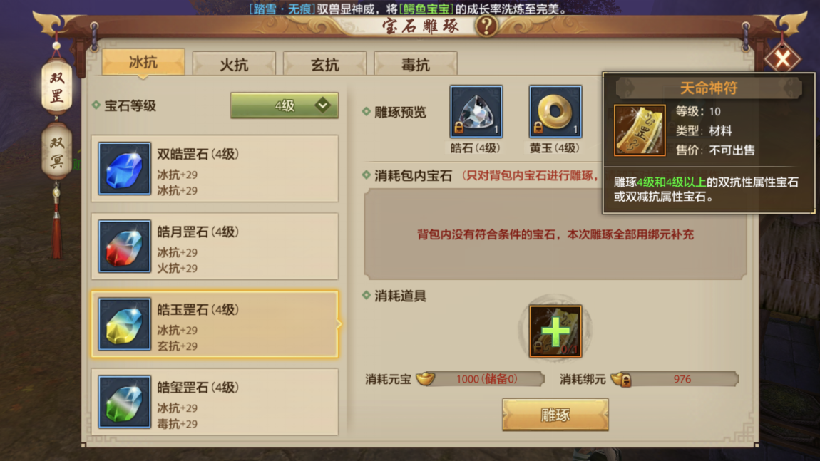 我们可以使用两种4级以上的抗性宝石或冥石进行雕琢。雕琢后两个宝石的属性融合成为一颗宝石。例如使用黄冥石和绿冥石雕琢则雕琢出黄绿冥石,他的属性为两个冥石相加。想要雕琢宝石就需要天命神符和大量的绑元和元宝。
