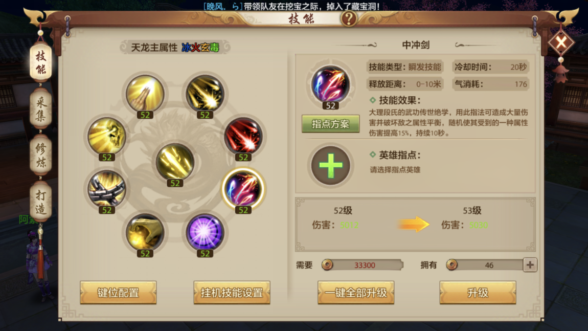 配合天龙的特有技能中冲剑就会100%提高伤害了。如果走极致暴力路线则建议选择一种合适的属性集中培养。双冥石也要集中一种属性进行雕琢。