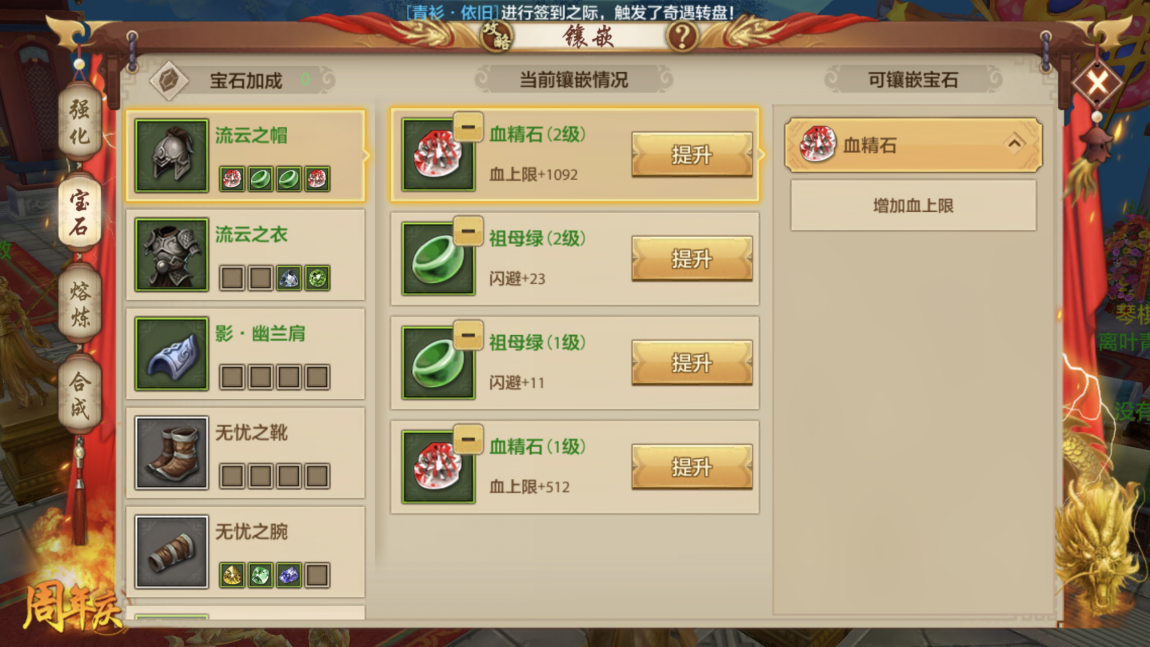 血晶石-祖母绿是一组防身套装,加血加闪避提升我们的防御能力。变石-紫玉是攻击基础套装,加会心加命中提升基础的攻击,蓝晶石红晶石黄晶石绿晶石提升对应的属性攻击。