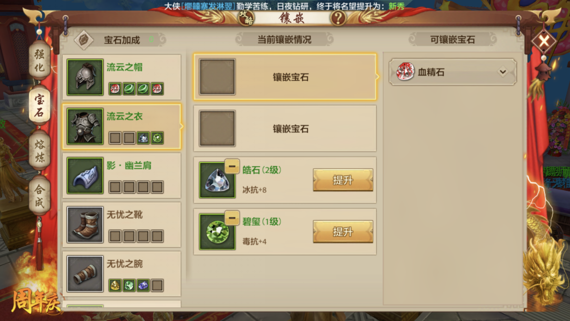 一级宝石只需四五元宝或者绑元。二级宝石需要20至30元宝或绑元。冥石要比普通的宝石贵一些。