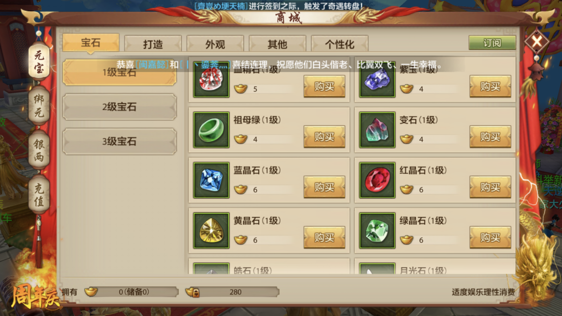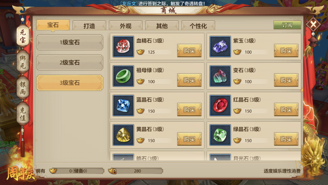 宝石可以在商城购买也可以通过珍珑棋局活动副本掉落。在活动中还可以触发奇遇获得二三级宝石。宝石在元宝和绑元商城都有出售。