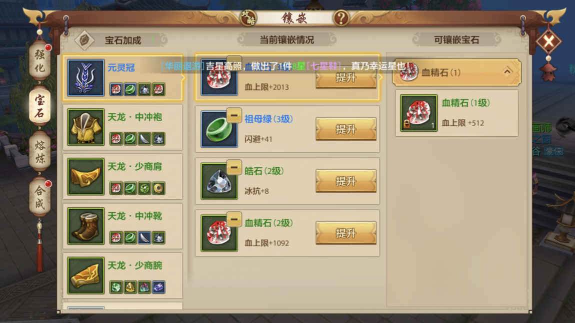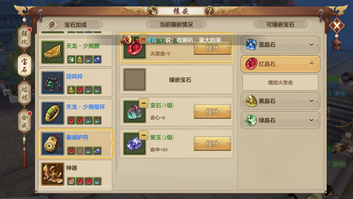 如果我们要打造高攻高暴击的天龙就需要在镶嵌宝石时尽量提升装备的攻击命中和会心。项链和护腕以及戒指护这四件装备上尽量装备高等级的宝石变石和紫玉提高命中与暴击效果。
