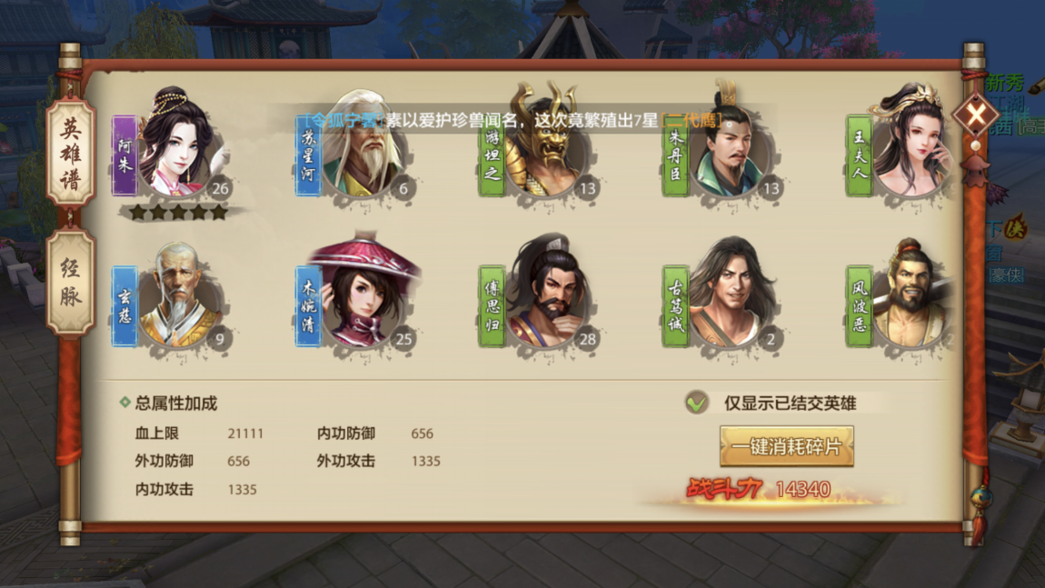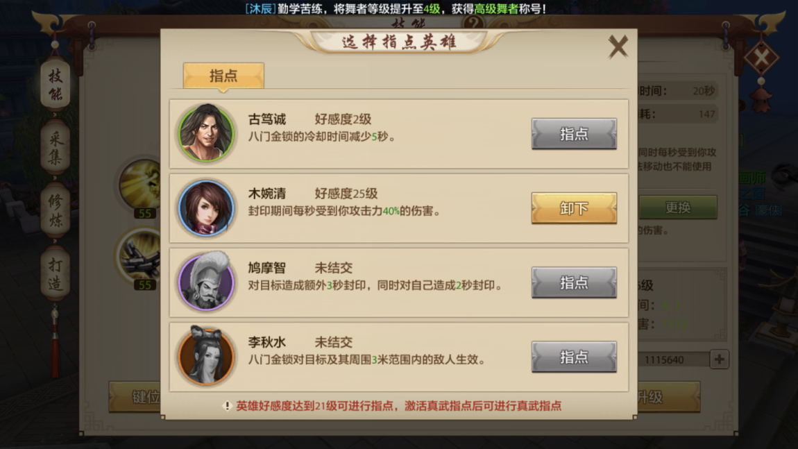 我们在试炼活动中可以合成英雄人物提升我们的战斗力,当英雄人物的好感度提升至21级以上就可以对我们的招式进行指点。