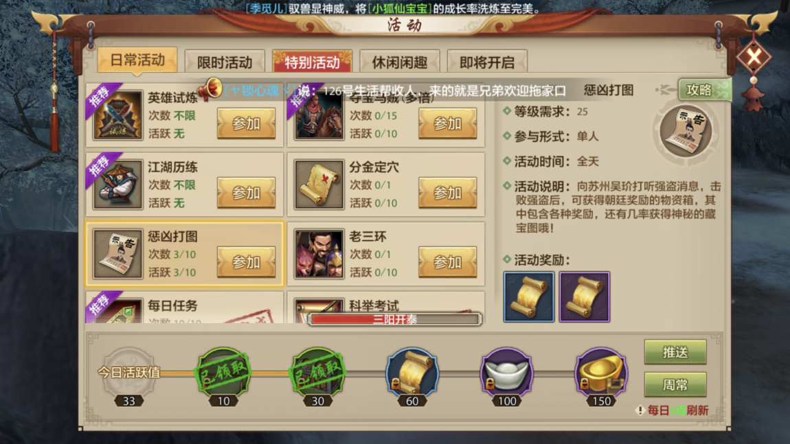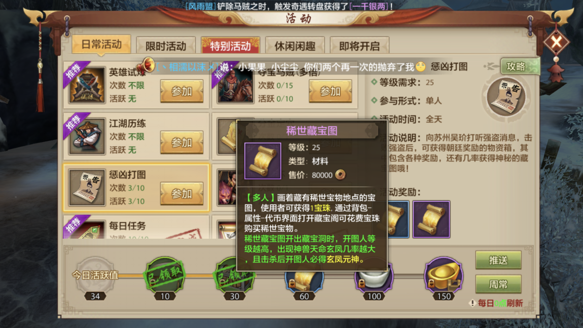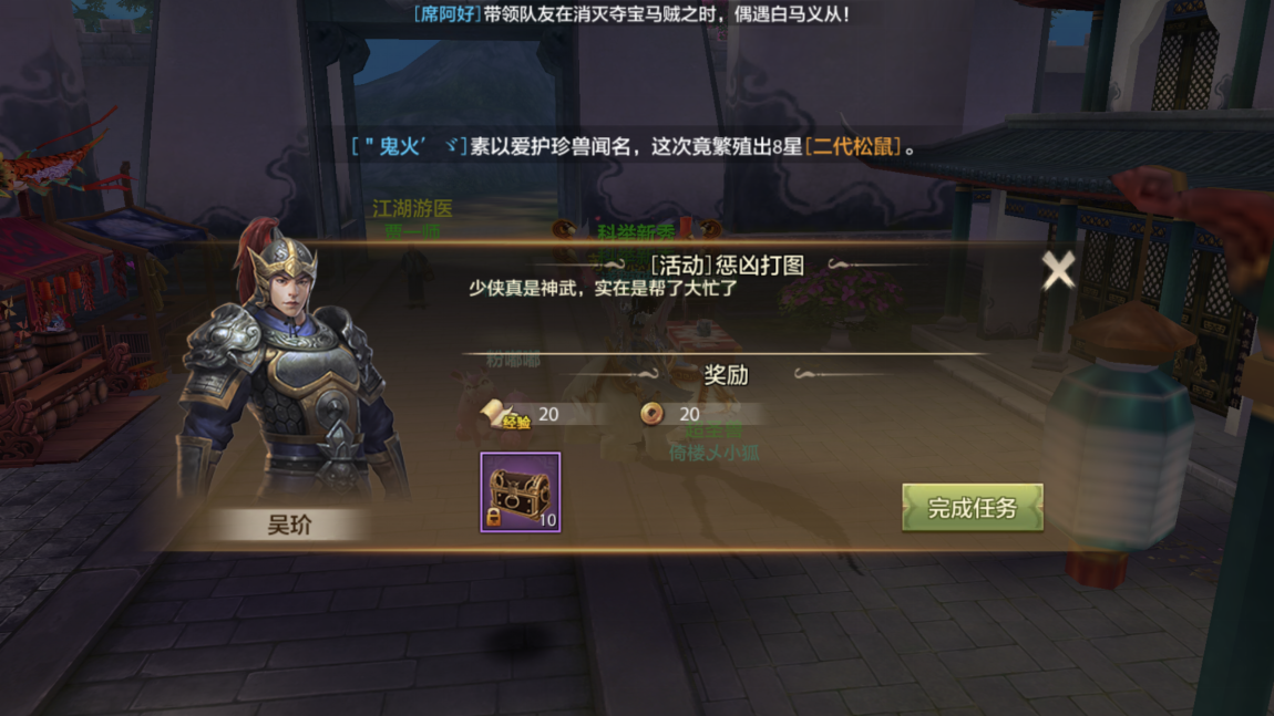 打图也叫惩凶打图是我们到达25级以后单人参加的一项活动。我们来到苏州吴玠处打听强盗消息,击败强盗后可获得朝廷奖励的物资箱其中包含各种奖励还有几率获得神秘的藏宝图。