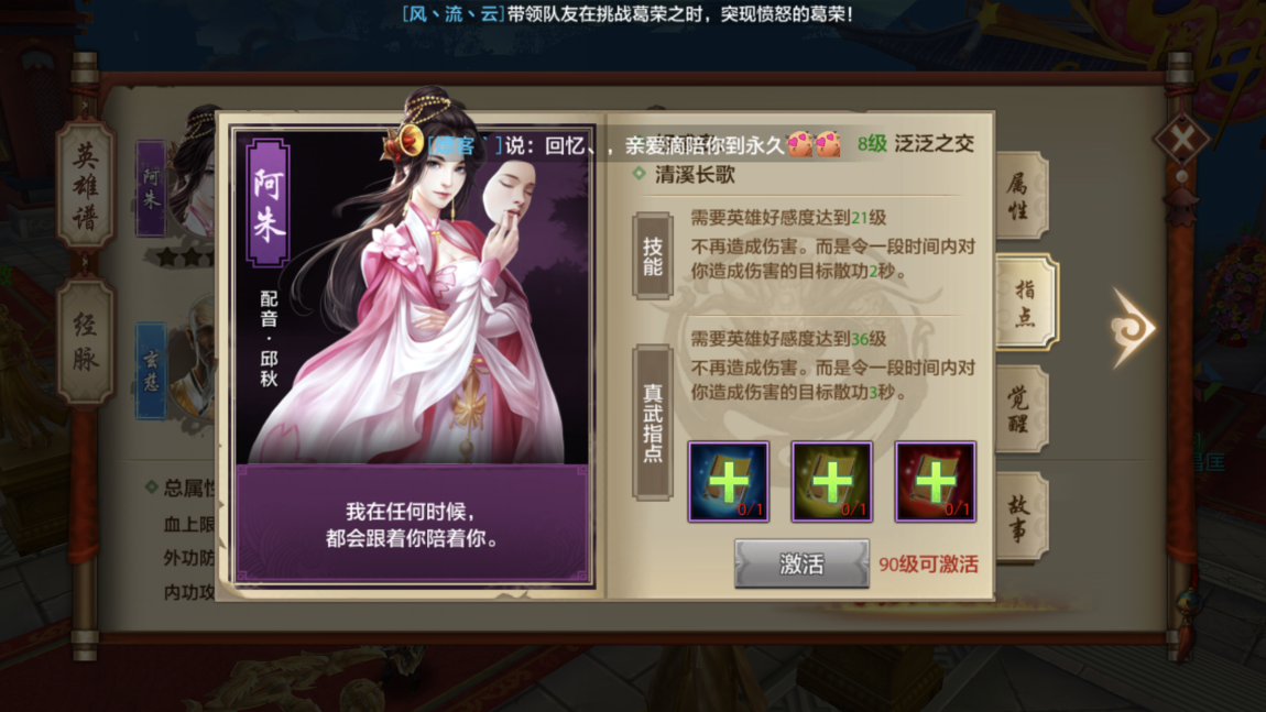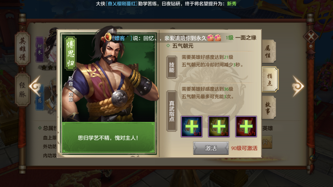英雄指点玩法如果运用得当可以发掘技能的新效果,当英雄人物的好感度提升至21级以上就可以对我们的招式进行指点。
