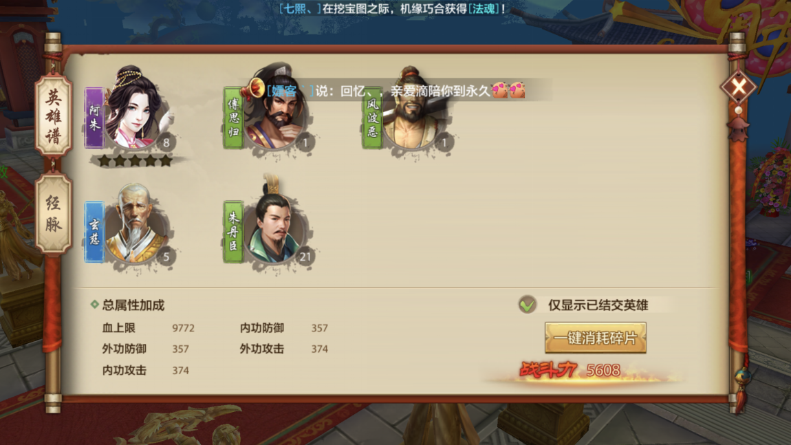 二是另一短时间内对你造成伤害的目标造成散功2秒。应该使用玄慈指点,他可以对纵横状态的目标造成伤害提高50%。当英雄好感度提升至30级则可以帮助角色打通经脉提高战斗力。