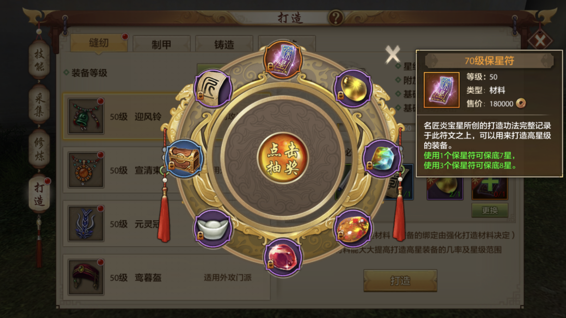 如果想要保底获得7星以上极品装备就还需要加入保星符。例如打造满级90级装备想要打造7星及以上装备就需要加入1张90级保星符,如果想要获得8星级以上装备则需要加入3张90级保星符。