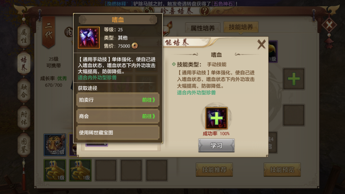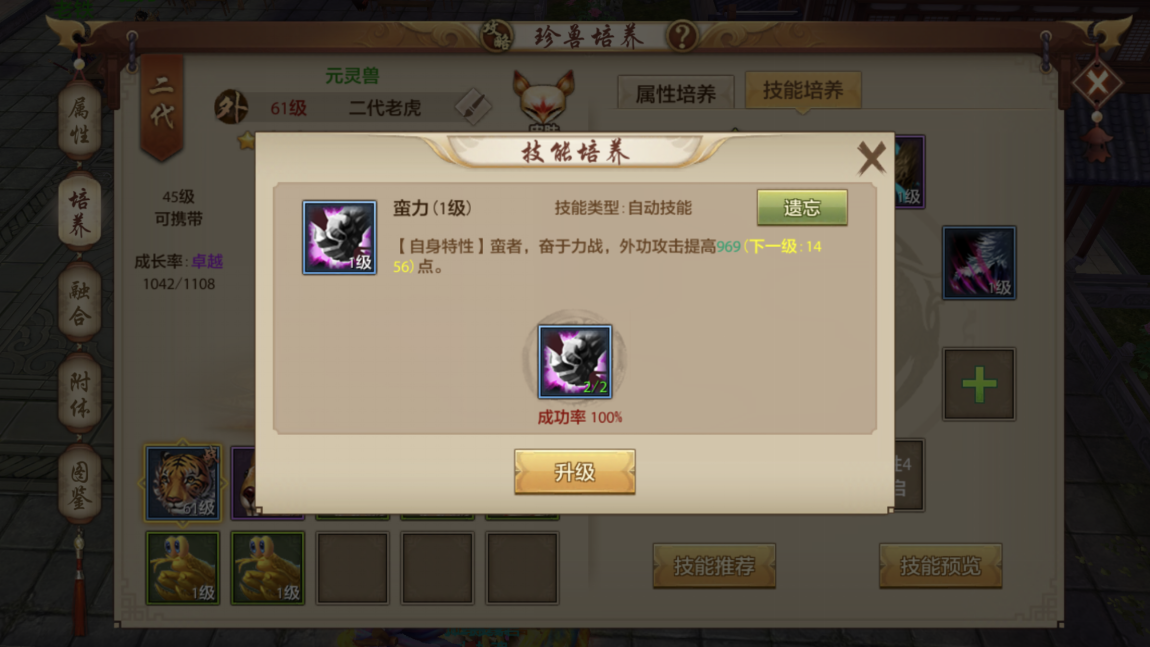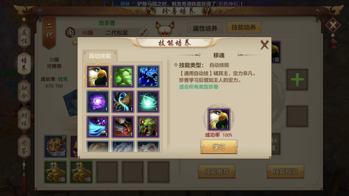 第三打造合适的珍兽技能。神兽和珍兽可以学习技能,每只珍兽可拥有一个手动技能和八个自动技能,手动技能由玩家自主释放,自动技能则为珍兽自行施放。技能学习后可使用相同技能书继续提升等级,技能等级越高技能效果和战斗力就越强大。