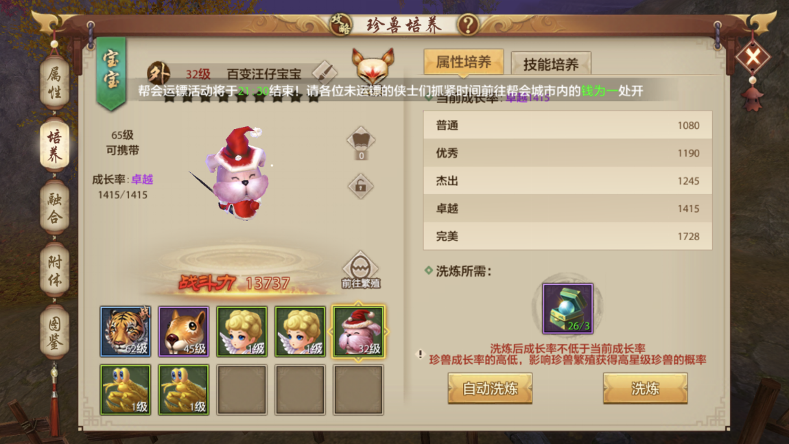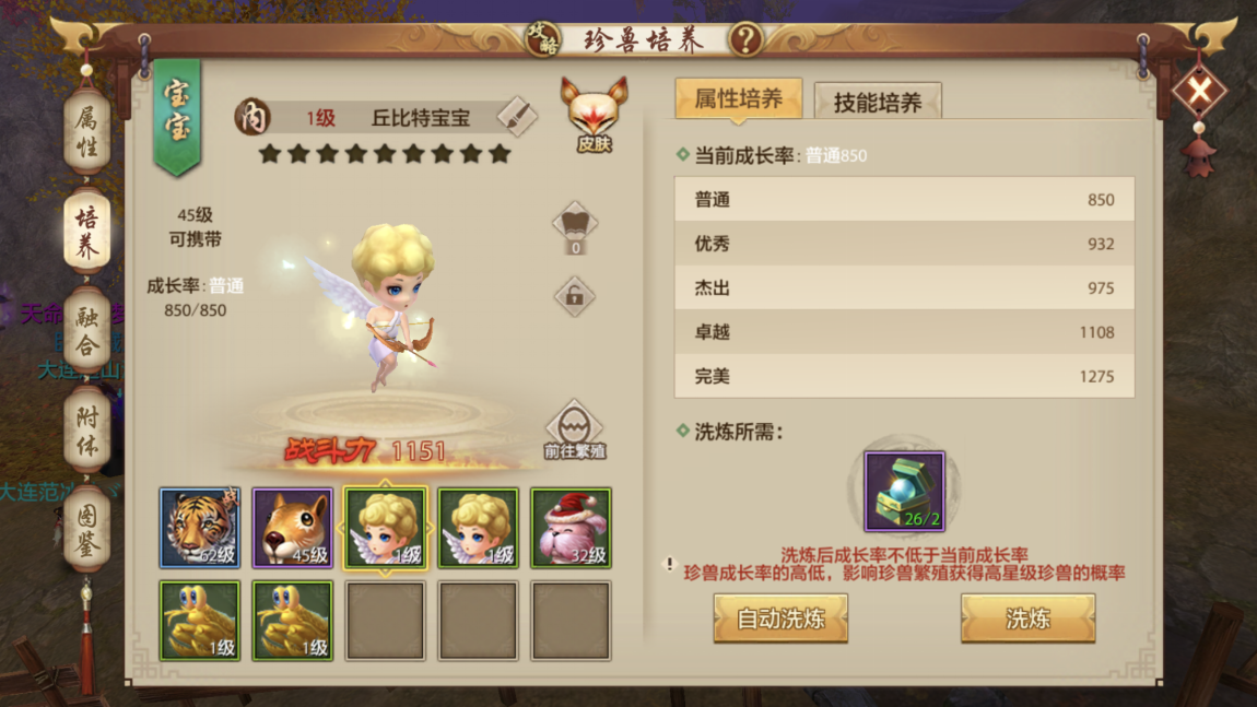知道了珍兽宝宝如何评定我们就可以有针对性地提升宝宝。首先我们可以对珍兽宝宝进行洗练。在洗练时有概率将成长率提升至完美。参与繁殖的珍兽宝宝成长率越高,获得高星二代珍兽的几率越大其二代珍兽的成长率越高。
