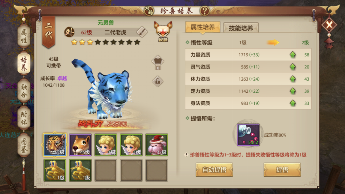其次我们可以对珍兽提升悟性,神兽和二代珍兽均可以提升悟性。悟性提升后珍兽的各项属性将获得提升。直接增加珍兽的各项属性数值级战斗力而且会开放更多的技能栏。